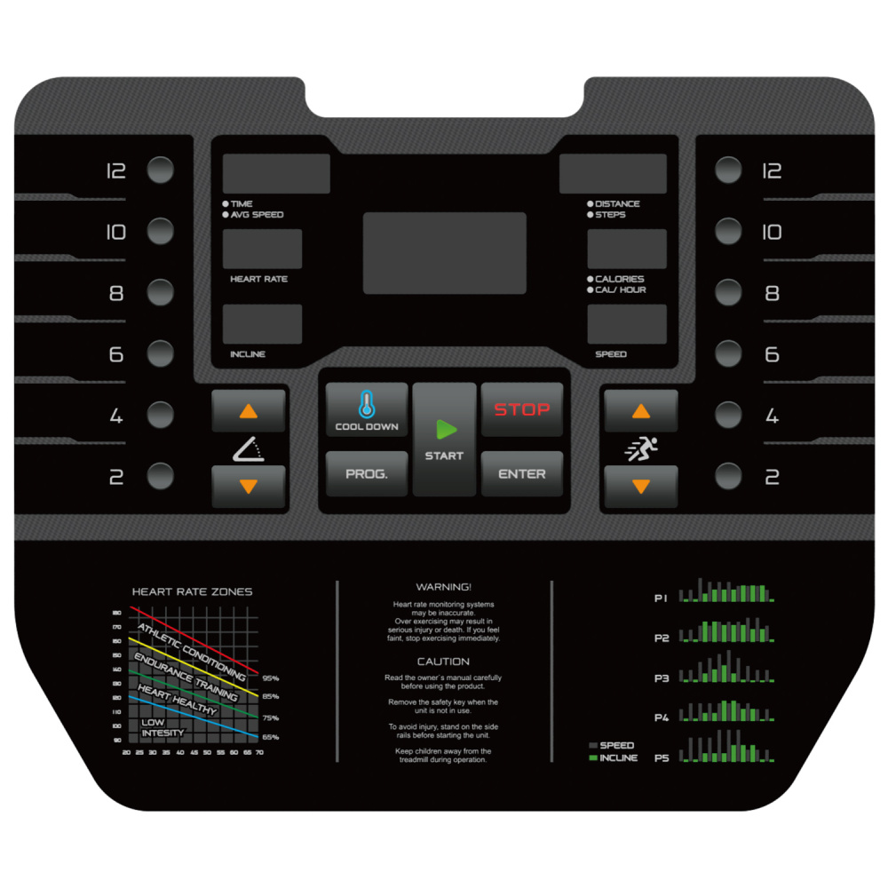 Консоль оснащена ярким LED-дисплеем, на котором отображаются все основные показатели тренировки: скорость, время, дистанция, калории, пульс, количество шагов и преодоленная дистанция на виртуальном 400-метровом треке. Датчики пульса позволяют точно отслеживать сердечный ритм. Встроенные программы – от ручных до целевых (по времени, калориям и расстоянию), а также режимы по частоте сердечных сокращений и пользовательские настройки – дают большой выбор тренировочных сценариев.