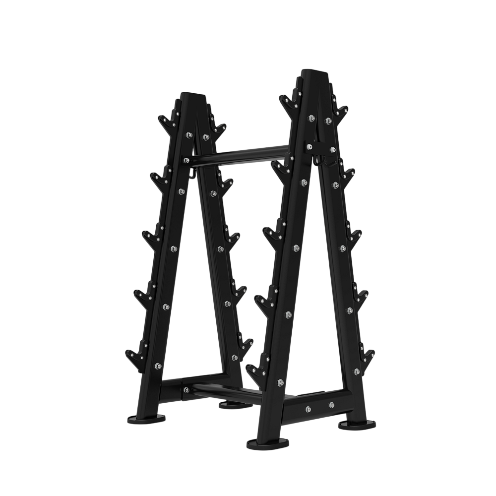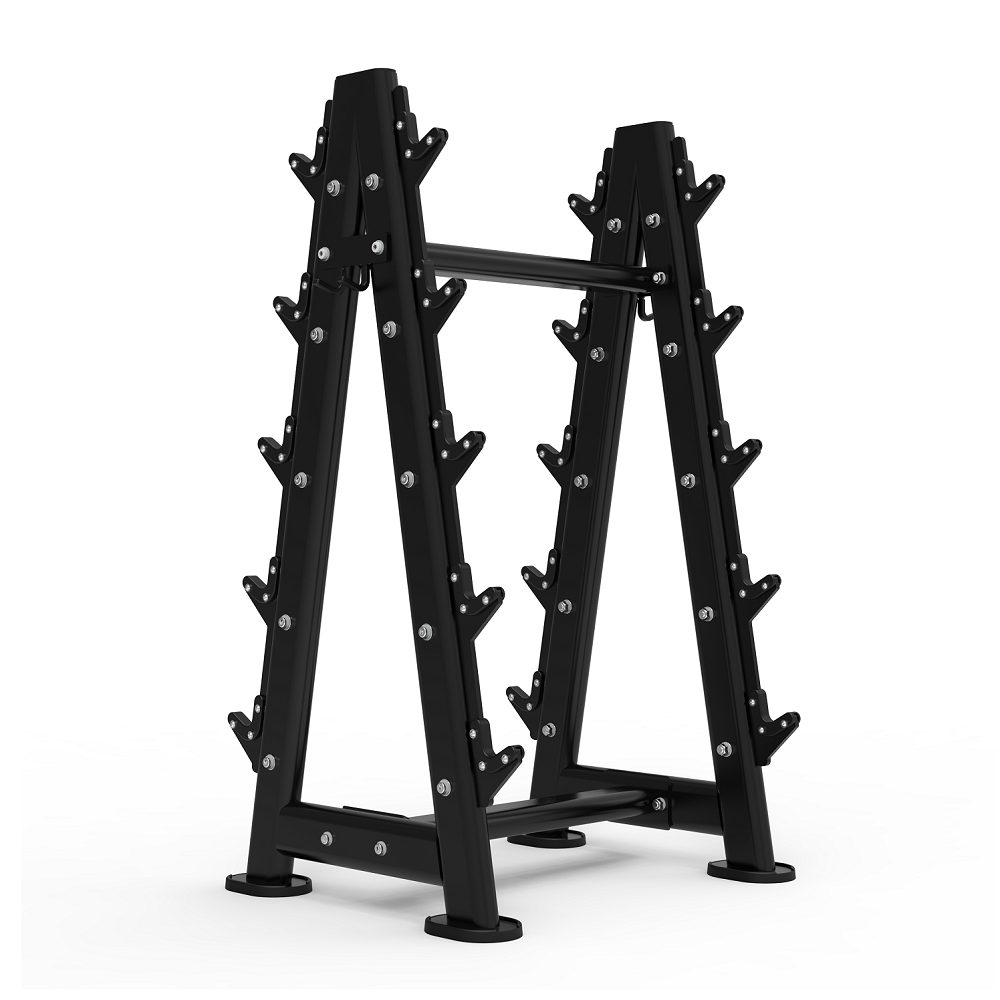 - Эффективное использование пространства для организованного хранения и удобного доступа к 10 штангам с фиксированным весом, с прямым или изогнутым грифом.