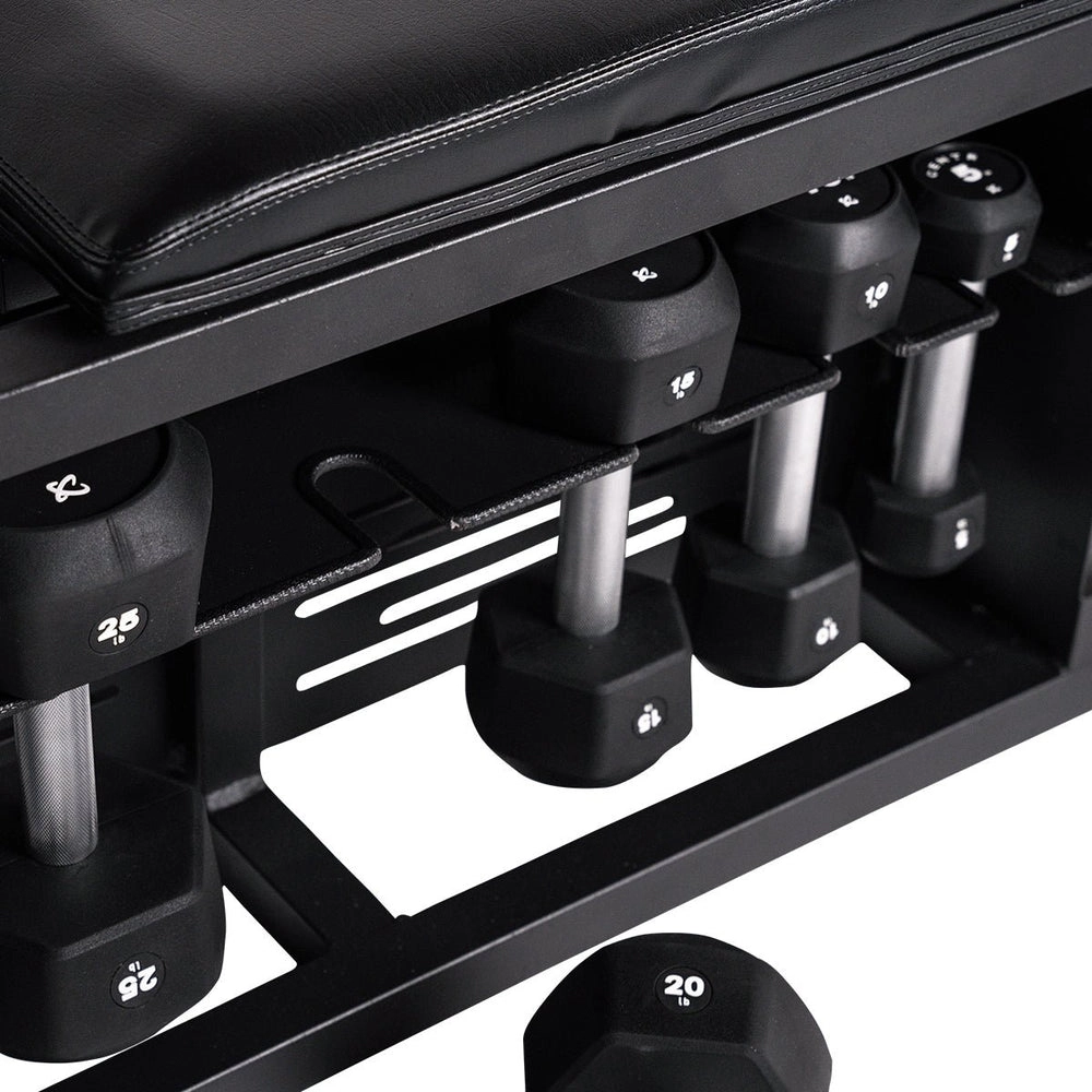 - Встроенное место для хранения спортинвентаря: рассчитано на хранение до 12 гантелей. Дополнительный отсек – удобное место для хранения эспандеров, поясов и других мелких аксессуаров.