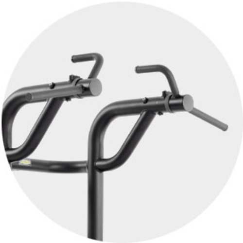 Рукоятки для подтягивания обратным хватом и ручки для отжиманий – угловые, что позволяет взяться за них разными способами и выполнять разные движения, прорабатывая разные группы мышц. Встроенная ступенька помогает дотянуться до ручек легко и без труда.