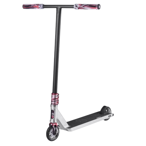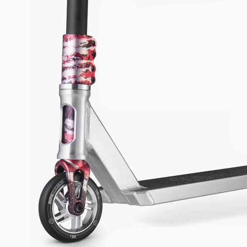 Модель с системой компрессии SCS, которая распространена в профессиональных трюковых самокатах, максимально устойчива к прыжкам и тяжелым приземлениям. Хотя она и имеет большой вес – безотказна при постоянном выполнении drop-in, backflip, и бар спинов. Компрессия в связке с высокопрочным Т-образным рулем из CrMo стали без пропила, дает максимально возможное сжатие из всех, рулевая колонка интегрированная и делает самокат легче, а промышленные подшипники износостойкие и не требуют постоянного обслуживания.