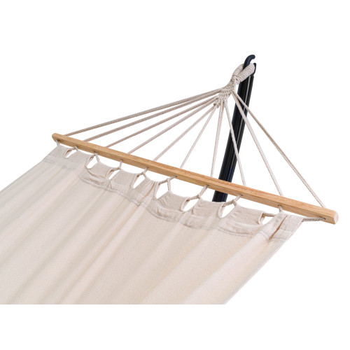 Основное полотно изготовлено из материалов высокого качества. Процентное соотношение – приблизительно 65% хлопка и 35% полиэстера. Готовое полотно обладает прекрасной прочностью, благодаря чему гамак Di Volio способен выдерживать до 120кг. Кроме этого Di Volio Rimini довольно компактен и весьма удобен в пользовании. Его габариты (200см*100см и общая длина в 280см) подойдут как для больших территорий, так и для не очень крупных балконов. А режим сборки обеспечивает максимально удобное хранение.