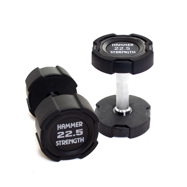 Гантель Hammer Strength уретановая отличается превосходной прочностью благодаря двойному или тройному замку, надежно закрепленной системе крепления головы к ручке. Антипрокатные головки, компактный дизайн и жесткие хромированные рукоятки делают их удобными в использовании и управлении. Высококачественный уретан обеспечивает превосходную стойкость к царапинам, порезам, истиранию и общему износу со временем, защищает оборудование от повреждений и обеспечивает длительную эксплуатацию, а насечки на ручке способствуют уверенному хвату даже без перчаток. Благодаря компактным размерам гантель легко транспортировать и хранить. Цельная конструкция из стали, диски толщиной 8 мм и эргономичная ручка делают эти гантели идеальными для домашних и профессиональных занятий.