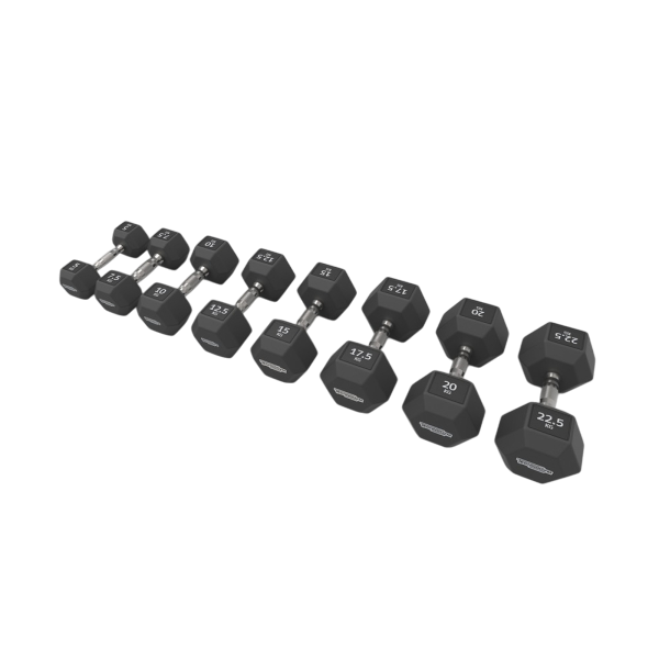 - В набор входит 8 пар: 5, 7.5, 10, 12.5, 15, 17.5, 20 и 22.5 кг