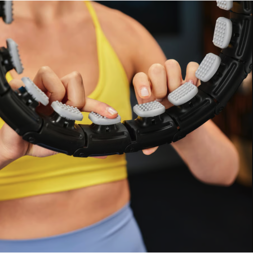 Обруч оснащен 24 регулируемыми секциями, которые легко соединяются и позволяют подогнать диаметр под талию до 106см. Благодаря этому он плотно прилегает к телу и не спадает во время вращения, даже при активных движениях. Такой массажный обруч для фитнеса в домашних условиях – отличный вариант для начинающих и женщин после родов.