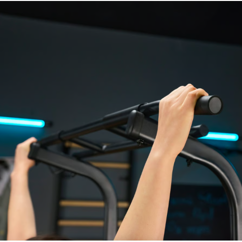 Верхняя перекладина позволяет выполнять подтягивание с тремя видами хвата: узким и двумя широкими. Это позволяет акцентированно тренировать спину, бицепсы и плечи. Мягкое покрытие с пеной на ручках предотвращает скольжение рук и обеспечивает комфорт даже при интенсивных подходах. Турник подходит для пользователей любого роста благодаря 12-уровневой регулировке высоты.
