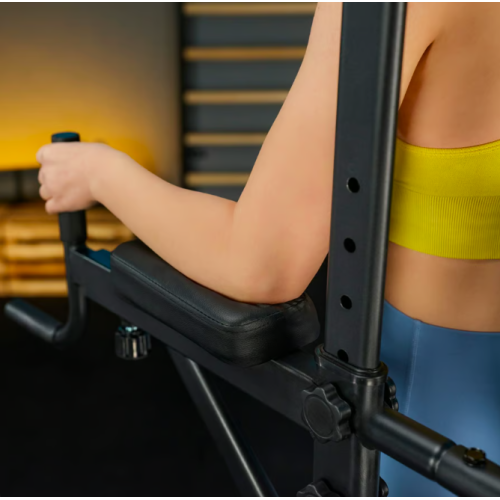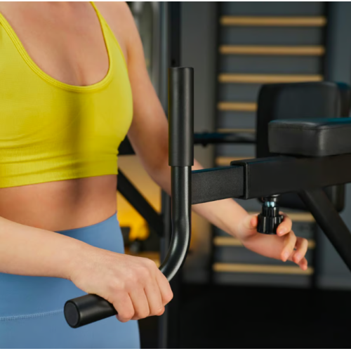 Силовая станция оснащена регулируемой мягкой спинкой и эргономичными подлокотниками, обеспечивающими комфортную поддержку при тренировках на пресс и трицепсы. Вы можете настроить позицию под себя, адаптируя расстояние и угол. Такой подход не только повышает эффективность, но снижает нагрузку на суставы и сохраняет правильную технику выполнения.